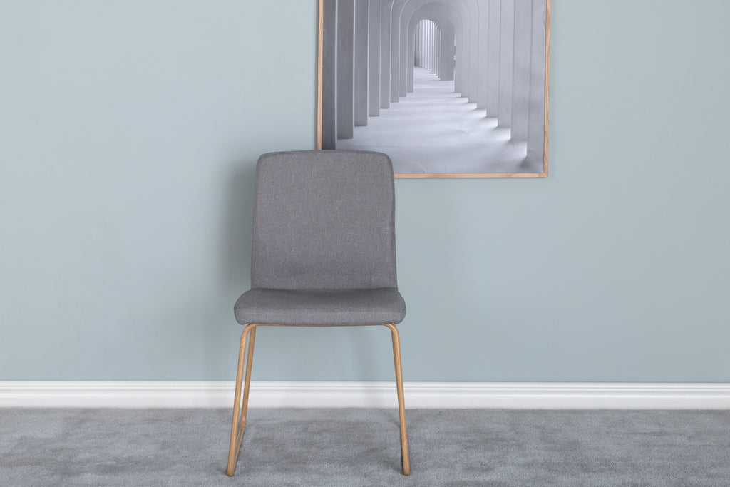 Mace has a minimalist design with a narrow base in exfoliated metal. Back and seat in light gray polyester fabric with soft padding for extra comfort. Complete with a delicious dining table and enjoy pleasant meals! Light assembly required.