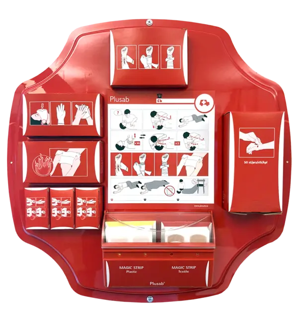 Första hjälpen-tavlan är en väggmonterad station som gör det enkelt att snabbt komma åt nödvändiga förbandsmaterial vid olyckor. Den tydliga märkningen på tavlan gör det lätt att hitta rätt material när det behövs. Tavlan innehåller ett urval av förbandsmaterial och plåster som täcker vanliga olyckor och är tillverkad för att tåla dagligt bruk i både arbetsplatser, skolor och offentliga miljöer. Den väggmonterade designen sparar plats och gör installationen enkel samtidigt som allt innehåll hålls organiserat och lättillgängligt.