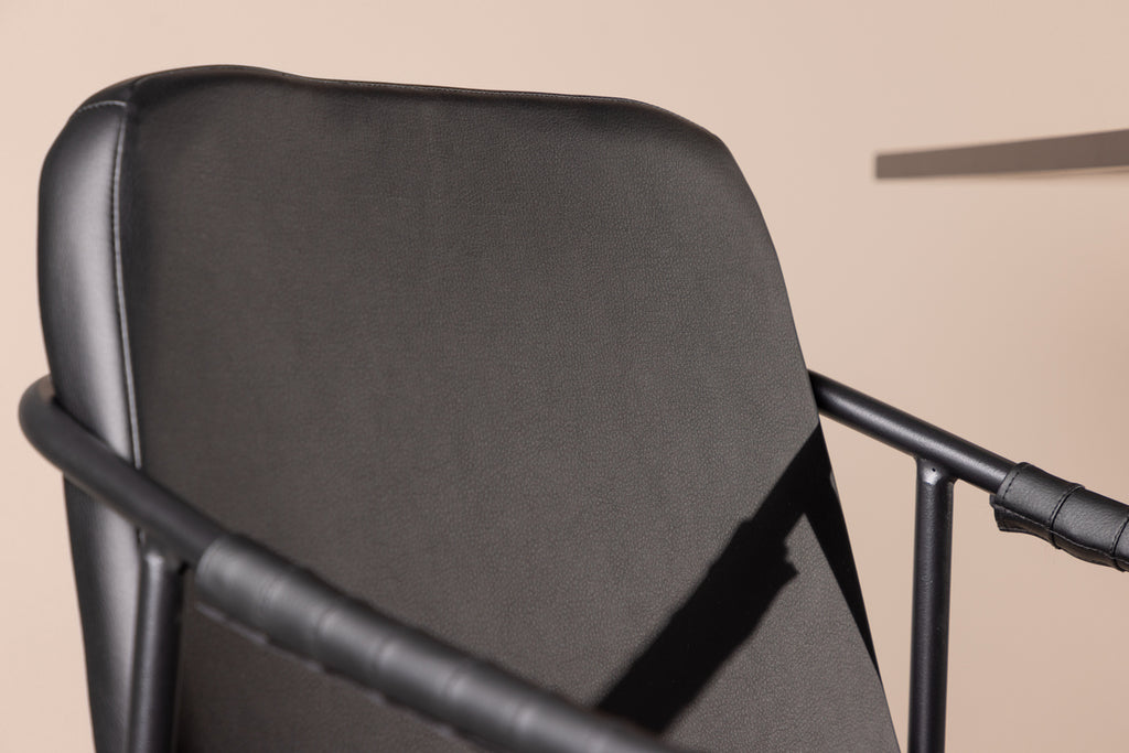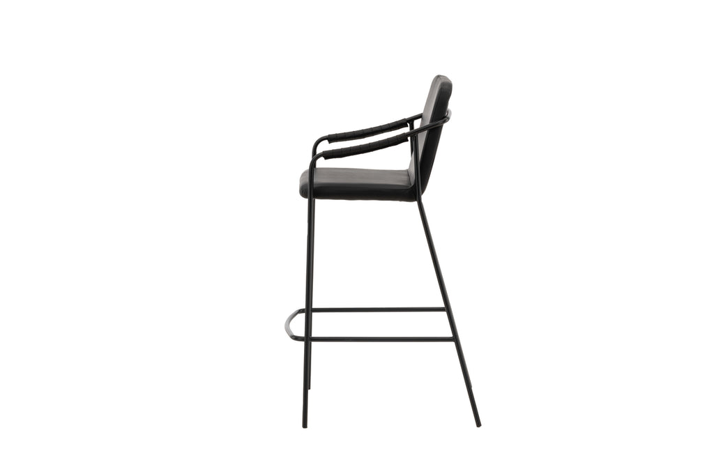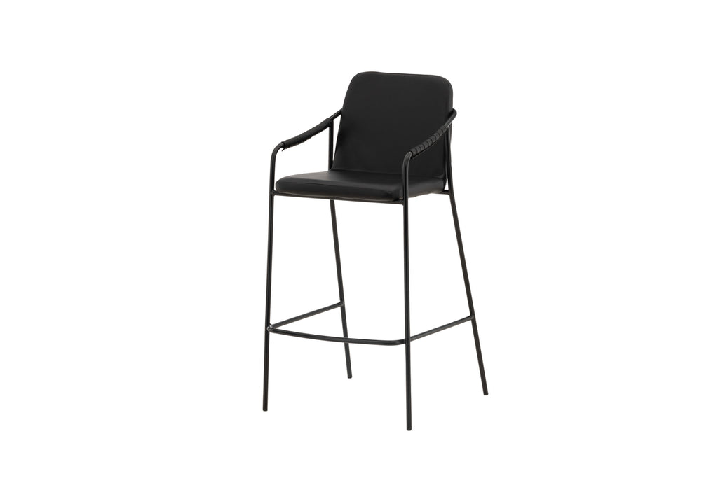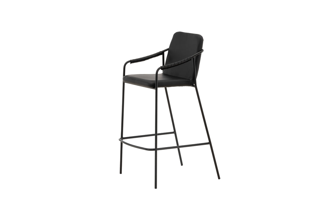 En modern barstol från serien TVIST som passar utmärkt i det moderna hemmet! Den här barstolen har en stoppad sits och helklädd design i svart PU med minimalistiska stolsben samt integrerade armstöd i svart stål. Placera intill bardisken eller ditt barbord och ta dina måltider till nya höjder med en barstol som snabbt skapar ett snyggt blickfång i ditt hem!