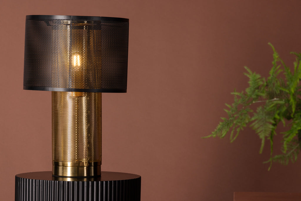 Gap, en unik bordslampa för det moderna hemmet! Lampan imponerar med sin guldiga fot och svarta lampskärm designad i ett fint meshmönster som gör att lampan blir en snygg inredningsdetalj. Placera lampan på byrån tillsammans med annan dekoration eller ensam som stilikon i ett mörkt hörn för att höja inredningsnivån. Den här lampan blir både en praktisk lampa med ett behagligt ljus och en viktig del av inredningen.