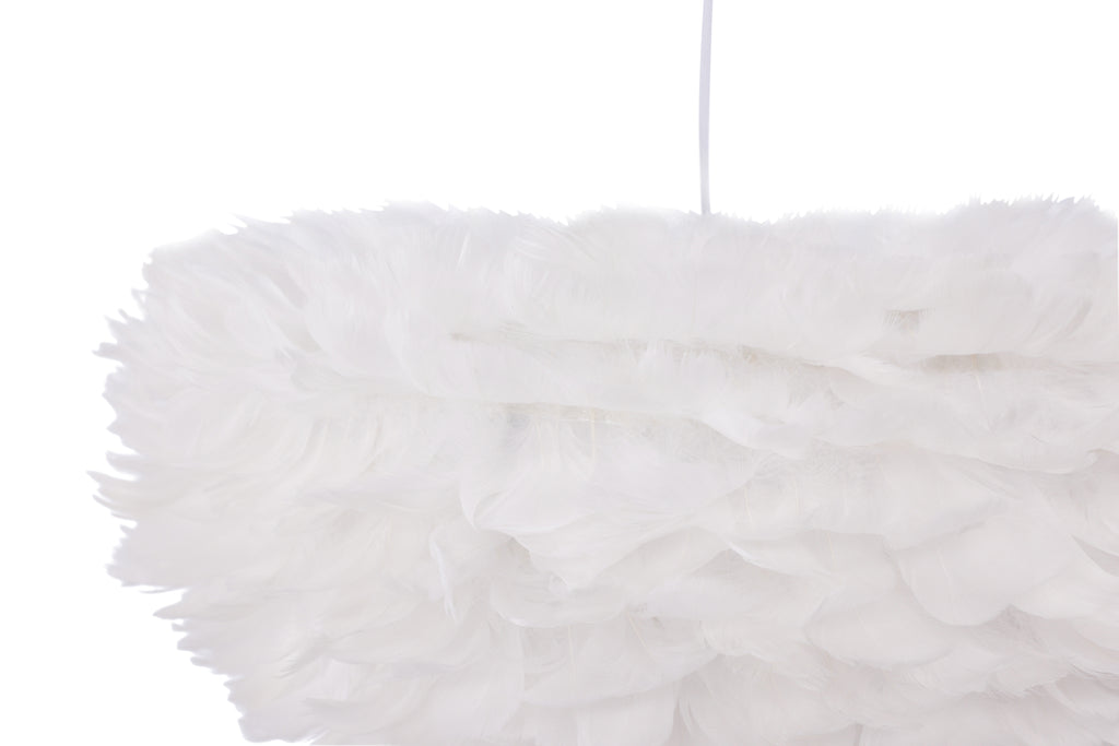 Nicola är en stilfull och elegant taklampa som passar perfekt för att skapa en mjukare känsla i hemmet. Lampan har konstgjorda fjädrar som blir en vacker inredningsdetalj och ger ett behagligt ljus som skapar en varm och ombonad känsla i rummet. Placera lampan i sovrummet eller i vardagsrummet så får du garanterat ett härligt blickfång! Nicola finns i fler storlekar.Mått36x75x75 Montering bör utföras av en elektriker.