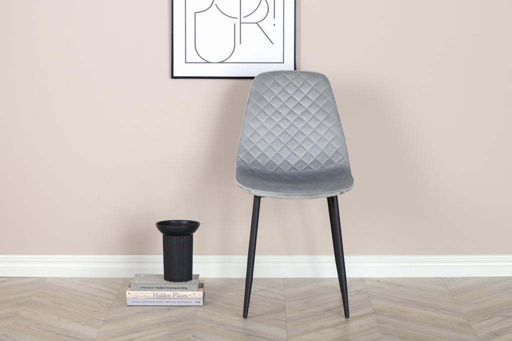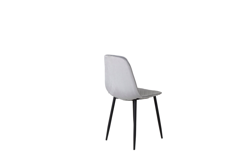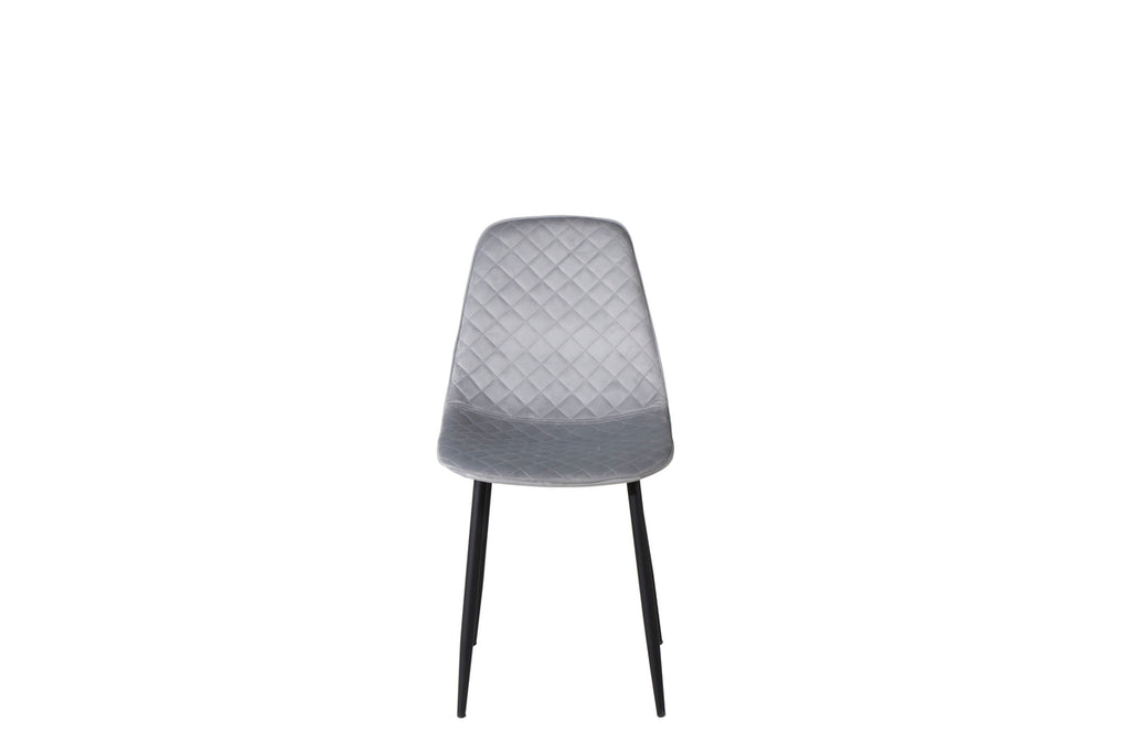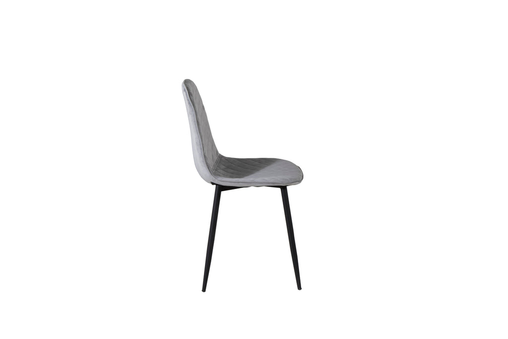 Stilren matstol i enkel utformning och snygga detaljer! Matstol från serien Polar har en genomtänkt design med lätt rundad rygg och sits i stoppad grått sammetstyg med dekorsömmar på insidan som bildar ett dekorativt rutmönster. Ben är i svart pulverlackerad metall. Lättare montering krävs. Sitt bekvämt och skapa ett modernt blickfång i vardagsrummet.