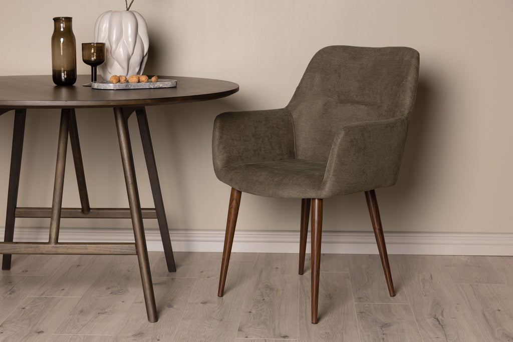 Slipp kompromissa mellan stil och komfort! Med den här bekväma matstolen från serien Tomorrow sitter du kvar länge och njuter av trivsamma stunder. Den helklädda sitsen med integrerade armstöd är i brunt polyestertyg och stolsbenen är lätt utsvängda i en modern valnötsbrun kulör. Skapa en inbjudande och charmig atmosfär som känns hemtrevlig och familjär!
