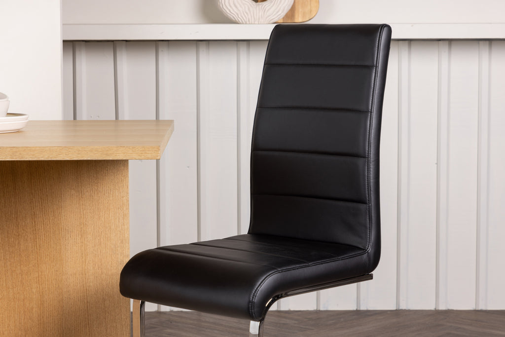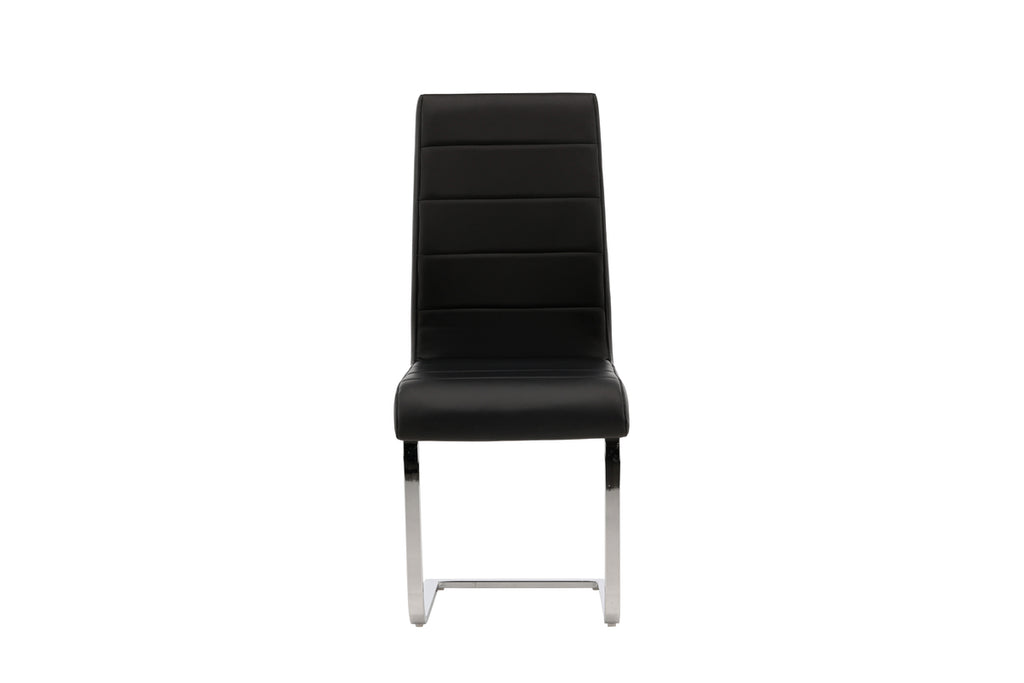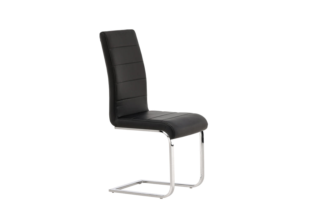 Tuff och bekväm matstol som drar blickarna till sig och imponerar med både komfort och stil! Matstolen TEMPO har en trendig design med raka nordiska former och dekorativ stomme. Stolen är i svart PU och stolsbenen är kromade. Benens design gör att stolen sviktar behagligt och ger dig ett skönt gung. Matcha med ett pampigt matbord så får du en komplett matgrupp att pryda hemmets hjärta med!