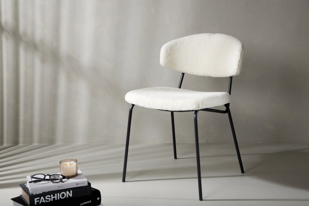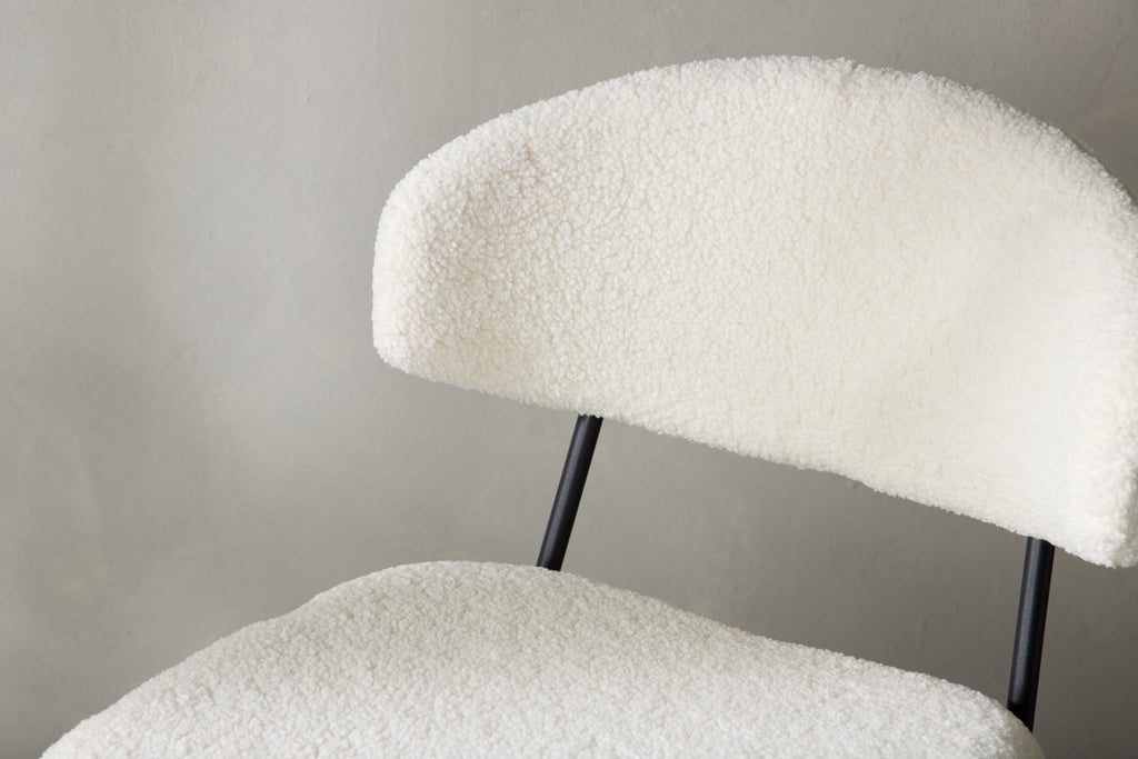 Matstolen från serien Chico är lika bekväm som iögonfallande! Den stilrena minimalismen kombineras utmärkt med den runda utformningen och smäckra boucletyget i beige kulör. Stolens sits och ryggstöd är stoppad för extra komfort och den smala, svarta stålkonstruktionen är helt i linje med trenderna. Möblera kring ett snyggt matbord och sitt bekvämt i flera timmar!