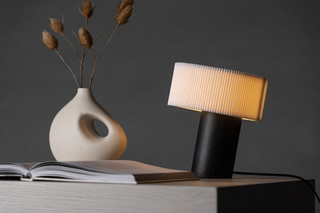 Med sin svarta cylinderformade fot och en lampskärm av veckat vitt papper är denna lampa ett mästerverk av modern design. Dess lutande lampfot blir inte bara en snygg visuell detalj utan också ett tydligt tecken på en modern lampa med unik design. Varje detalj är noggrant utformad för att förvandla ditt rum till en modemedveten oas av trend och harmoni.