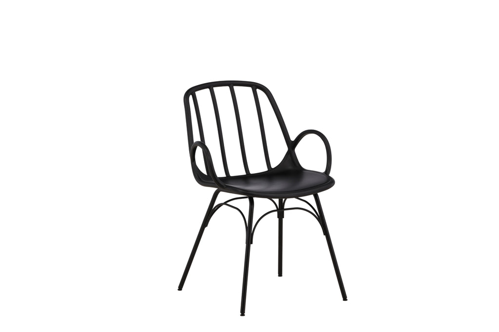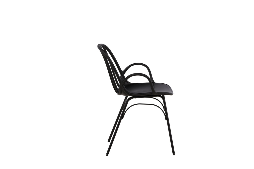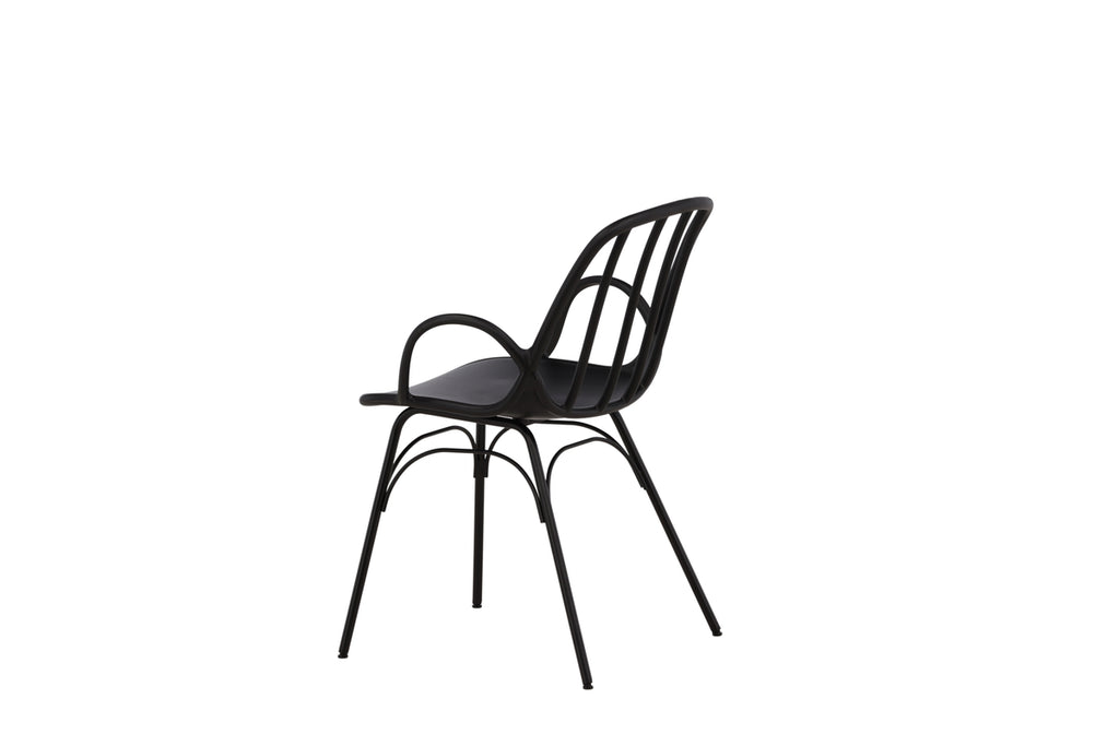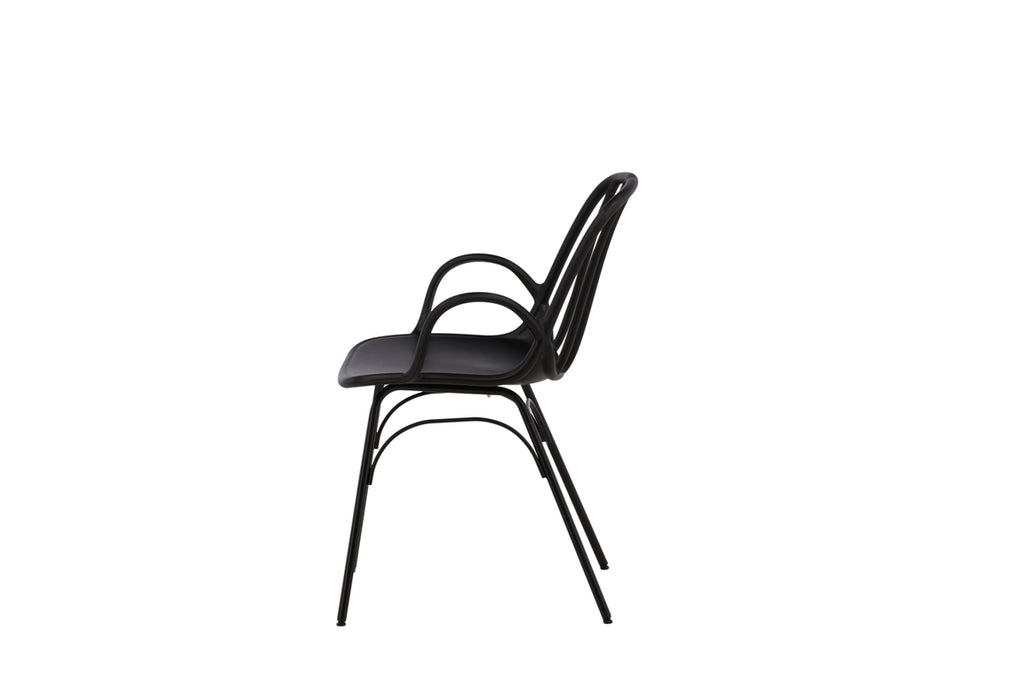 Dyrön - En svart matstol som skapar en personlig och modemedveten atmosfär i ditt hem! Den här läckra matstolen är lika stilren som praktisk, tillverkad i svart plast och stål. Sitsen har integrerade armstöd och en ribbad design i den lätt rundade ryggen. Stolsbenen är stilrent smala och lätt utsvängda i Skandinavisk design. Möblera kring ett matchande matbord så får du en komplett matgrupp att avnjuta dina måltider kring!