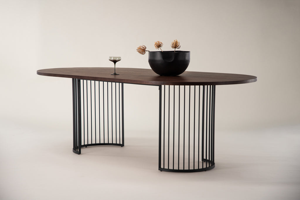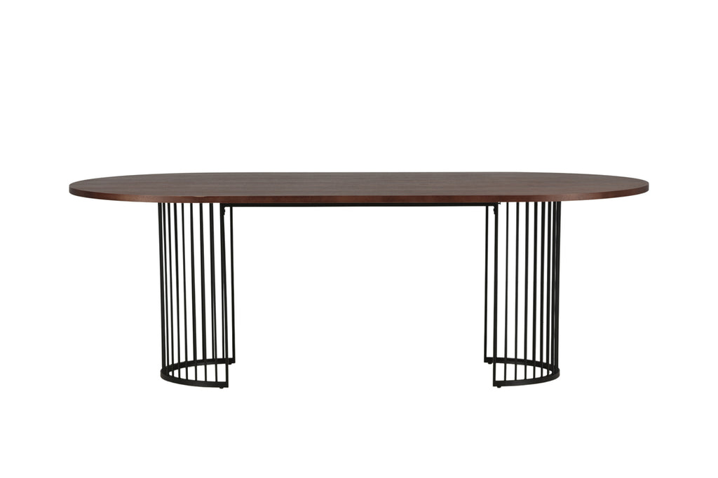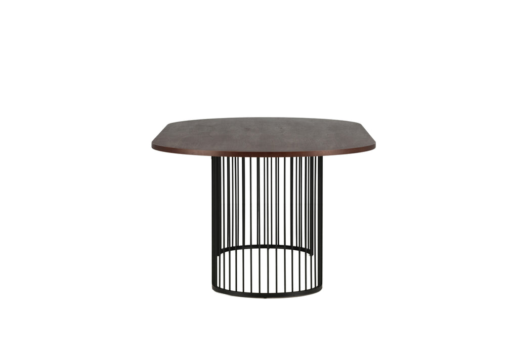 Skapa ett inbjudande och stilsäkert blickfång i hemmets hjärta med ett iögonfallande matbord från serien Hamneskär! Det här eleganta matbordet från Vind kollektionen har en oval bordsskiva i mörkt trä och ett dekorativt underrede i smal, svart stålkonstruktion som formas likt två halvcirklar. Här slipper du kompromissa mellan ett praktiskt och elegant matbord. Matcha med ett par snygga matstolar så får du den perfekta matgruppen för veckans alla måltider!