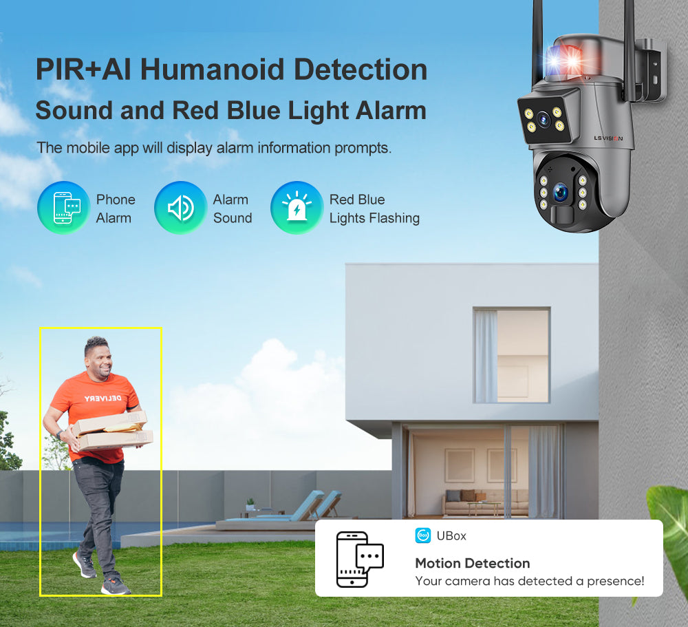 Kameran är utrustad med PIR-sensor och intelligent AI-teknik som kan identifiera mänskliga rörelser.