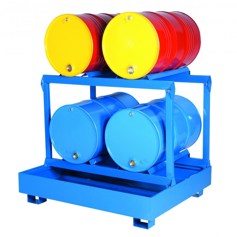 Denna fatpall är designad för säker och effektiv hantering av fyra liggande fat arrangerade 2 breda och 2 höga (2B/2H). Pallen är tillverkad i robust stål med blå pulverlackerad yta (RAL 5019) och är idealisk för industrimiljöer där hög säkerhet, hållbarhet och enkel logistik är avgörande.