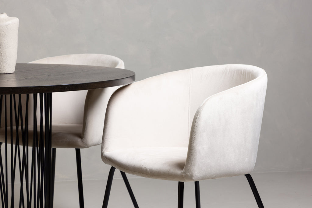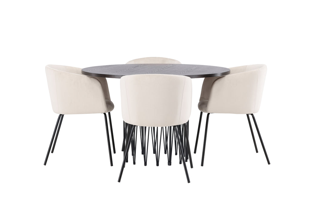 Möblera ditt hem i jordnära toner! Det runda matbordet Stone imponerar har en modemedveten design med en vacker brunfärgad bordsskiva i MDF med faner och ett dekorativt cylinderformat underrede i svart metall. Här i underbar kombination med våra bekväma matstolar Berit. Stolen har en helklädd design med lätt rundad rygg och sits i beige sammetstyg samt smala stolsben i svart järn. Den här matgruppen utstrålar lyx! Bordets mått: 120cm.