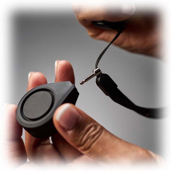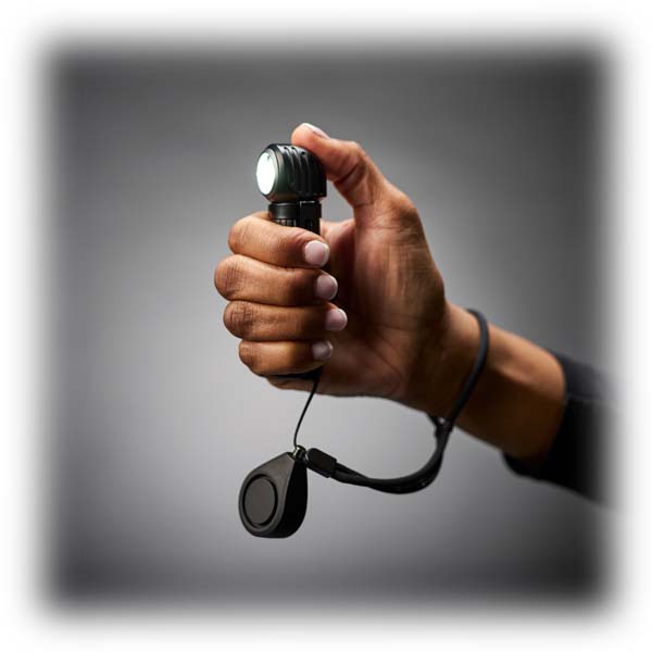 Överfallslarm Dra i säkerhetssprinten för att aktivera ett högljutt sirenlarm som hörs på långt avstånd. Larmet skrämmer bort angripare och drar till sig uppmärksamhet i en nödsituation.