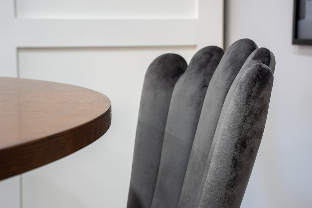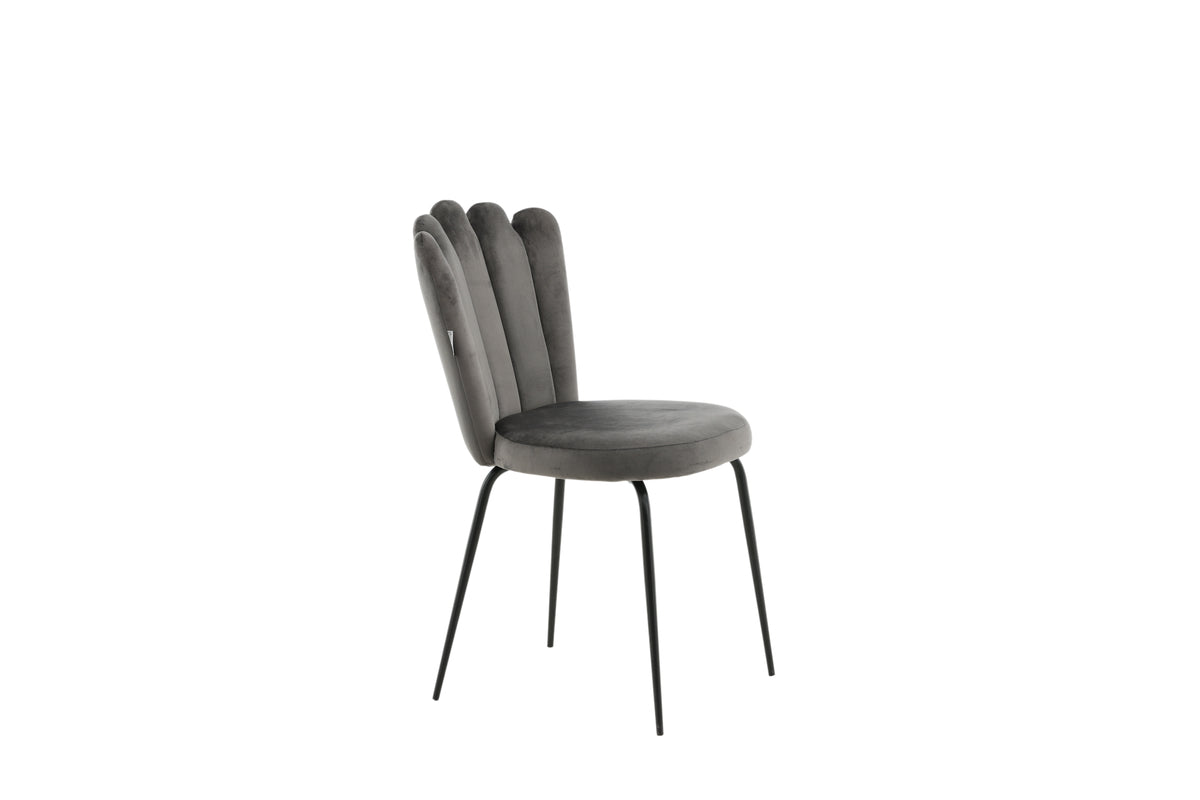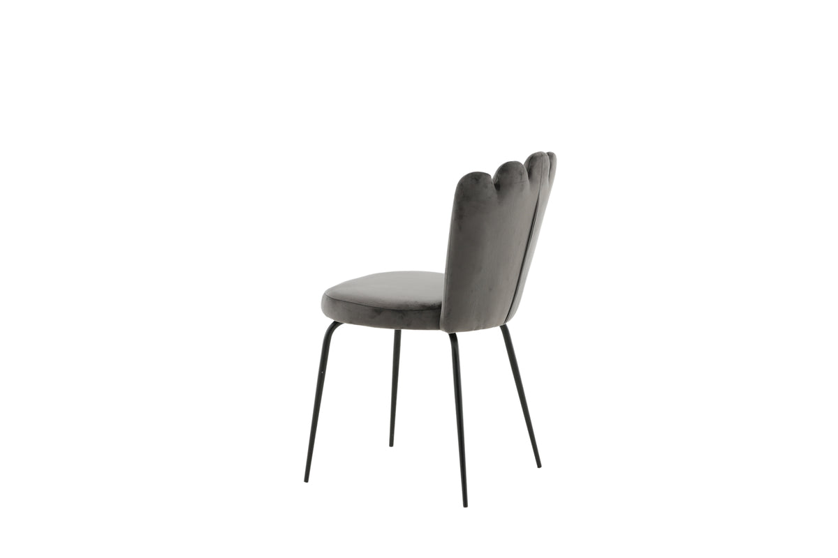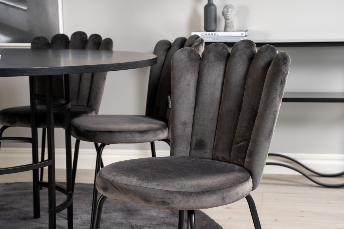 Limhamn matstol - en modern favorit i många hushåll! Den är matstolen har en inbjudande design med dekorativ snäckformad rygg med dekorsömmar och en rund sits i grått sammetstyg. Benen är i svart pulverlackerad metall. Skapa ett trivsamt blickfång i hemmets hjärta! Lättare montering krävs.
