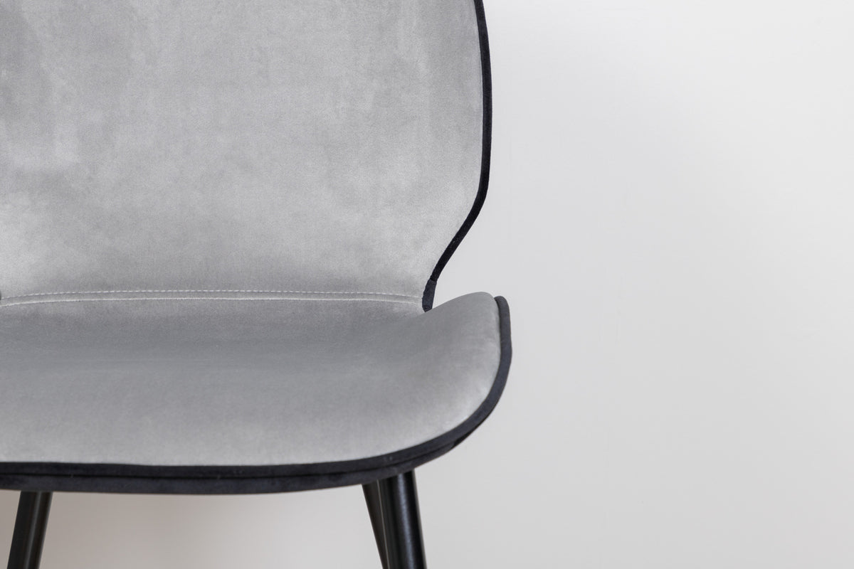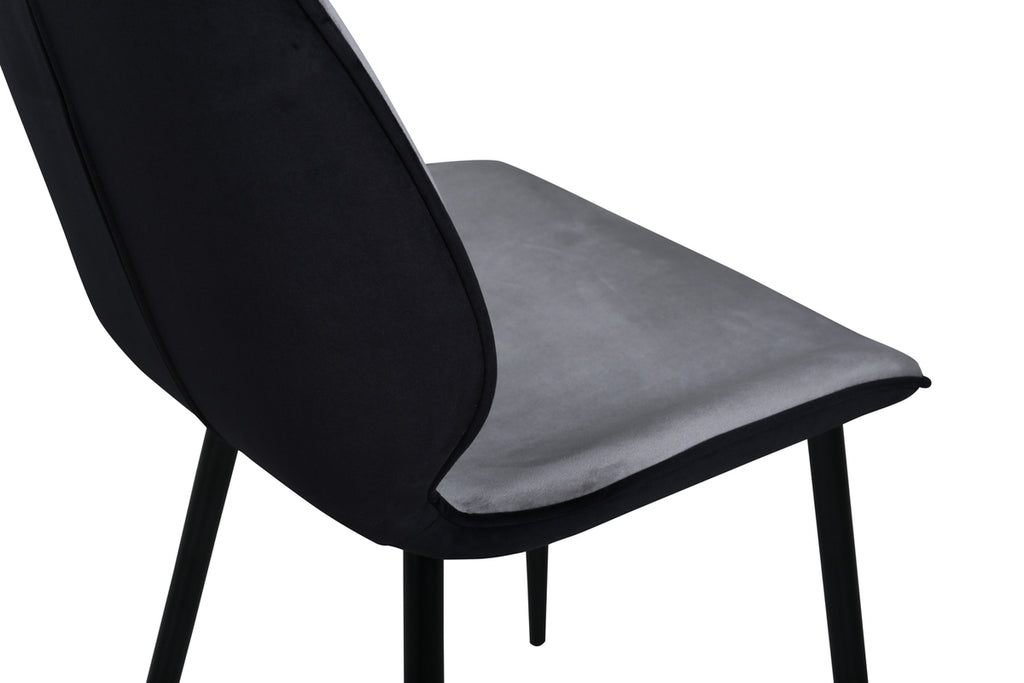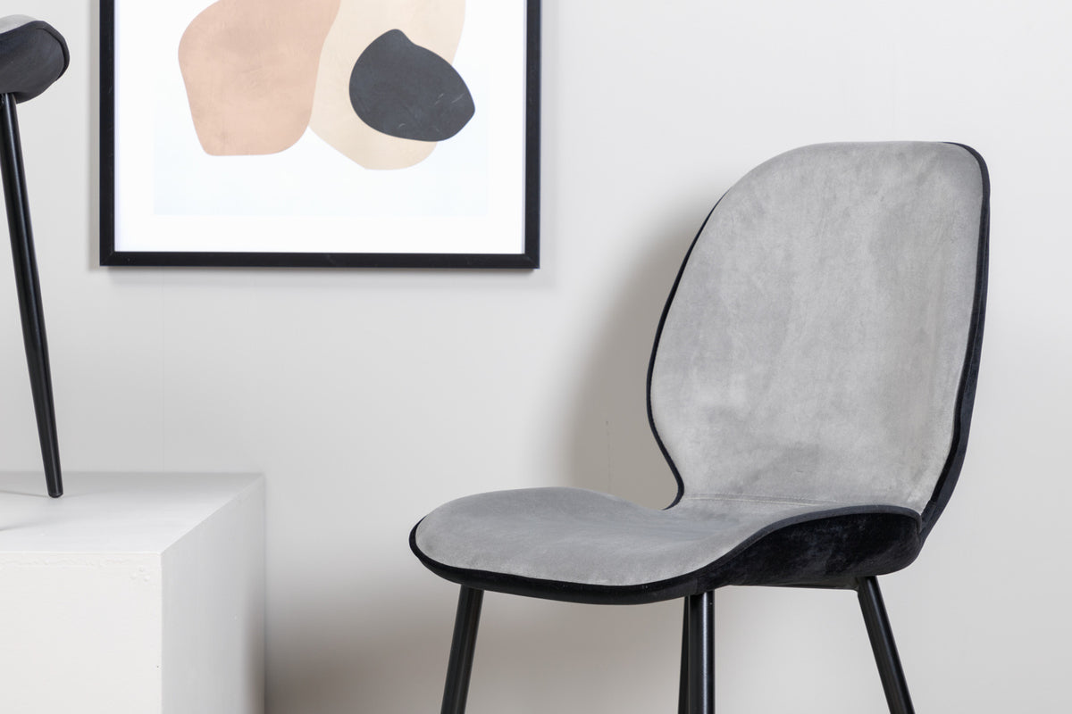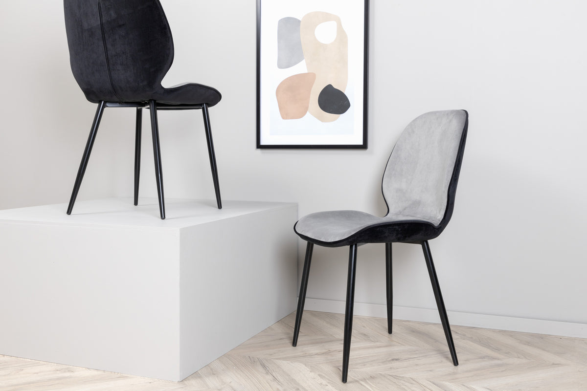 Skapa ett modernt blickfång i vardagsrummet med matstolar från serien Emma i smäcker design! Stolen har en följsamt rund utformning med en sits i grå sammet och polyesterlinne samt lätt utsvängda stolsben i svart järn. Stolens rygg är svart vilket blir en trendig kontrast till stolens framsida. Låt tiden här bli till dagens höjdpunkt och slipp kompromissa mellan komfort och stil!