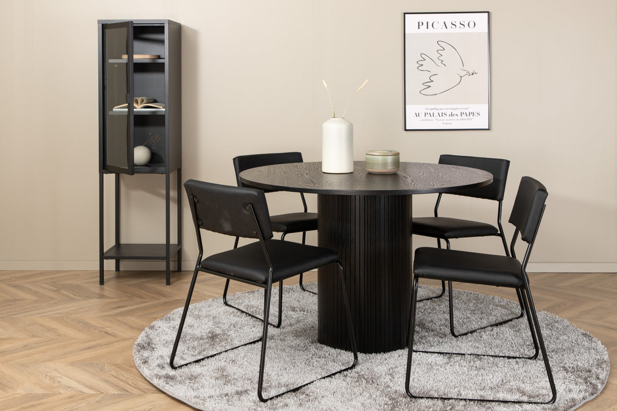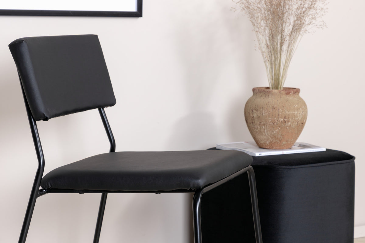 Skapa en charmig mittpunkt i hemmets hjärta med hjälp av stilrena matstolar från serien Kenth! Den minimalistiska, moderna designen skapar en luftig känsla. Stolen har en rygg och sits i svart polyuretanskinn och polyester samt dekorativt smala stolsben i järn. Lättare montering krävs. Komplettera med ett matchande bord och njut av trivsamma måltider.