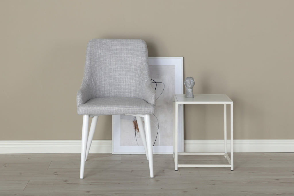 Skapa en charmig mittpunkt i hemmets hjärta med hjälp av stilrena matstolar från serien Plaza! Den genomtänka moderna designen har en stomme i vit pulverlackerad metall och ryggen/sitsen är i ljusgrått polyestertyg med mjuk stoppning. Lika snygg för ögat som bekväm att sitta på! Lättare montering krävs