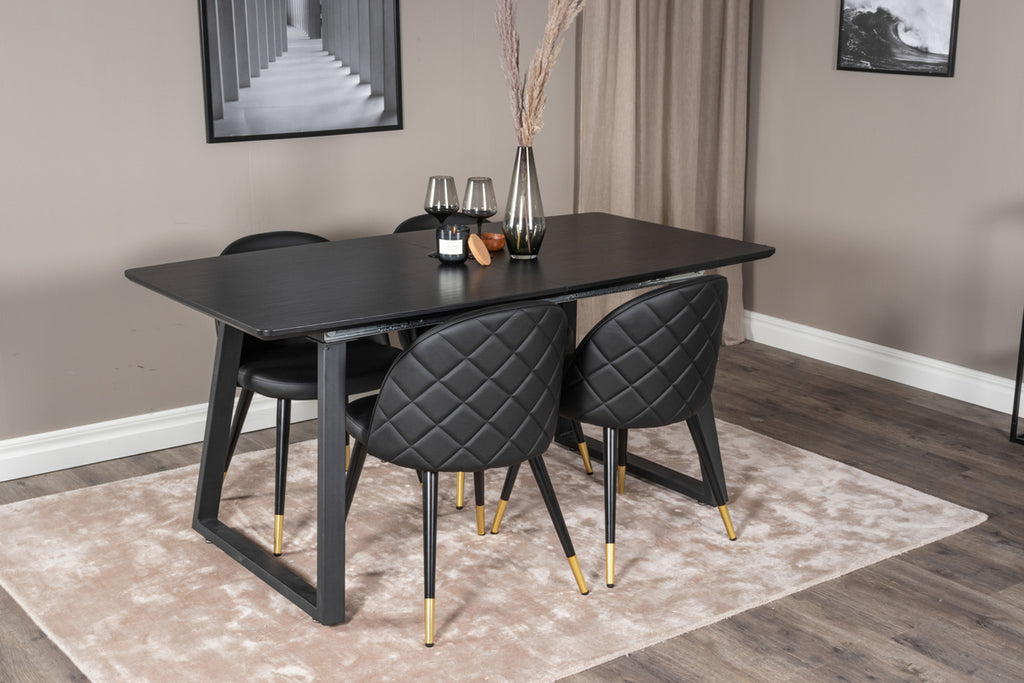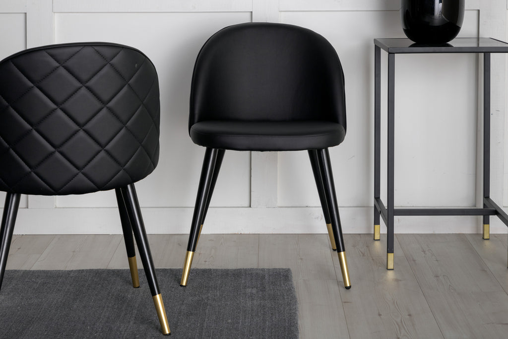 Velvet - en tuff matstol i detaljrik och lyxig design! Ryggen är rundad och är precis som sitsen mjuk stoppad i svart konstläder med dekorativ dekorsöm. Benen är i svart pulverlackerad metall med benslut i mässingsfoliering som skapar en iögonfallande helhet. Lättare montering krävs. Skapa ett modernt blickfång i hemmets hjärta!