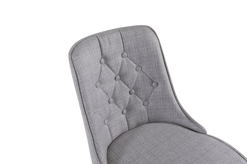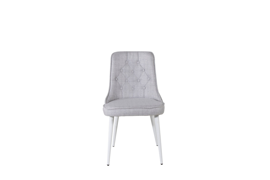 Bekväm, stilren och slitstark matstol från serien Velvet Lyx! Stolen har en helklädd design i smäckert grått polyestertyg med knappar och dekorsöm i ryggen som blir till en snygg detalj. Ben i vit pulverlackerad metall och mjuk stoppning i rygg och sits för extra komfort. Lättare montering krävs. Skapa ett pampigt blickfång i vardagsrummet!
