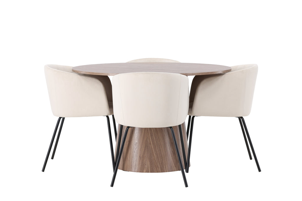 En favoritkombination i många moderna hem! Vårt underbara, runda matbord Lanzo har en genomgående helhetsdesign i MDF med en tunn toppskiva och en vriden cylinderformad stomme som är centrerad under bordets mitt. Kulören är jordnära och synliggör materialets mönster. Här i elegant kombination med våra bekväma matstolar Berit. Stolen har en helklädd design med lätt rundad rygg och sits i beige sammetstyg samt smala stolsben i svart järn. Det ska kännas lyxigt att slå sig ner för goda måltider! Bordets diameter: 120cm.