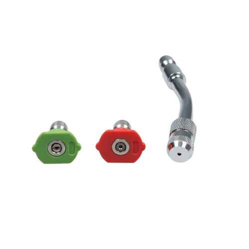 Sprutan levereras med tre munstycken för olika applikationer – grön (flatstråle), röd (punkstråle) och vit (dimstråle) – alla med snabbkoppling som passar både lansen och sprutpistolen. Ett batteri ingår som standard, med möjlighet att köpa till extra batterier eller välja modell med två batterier.